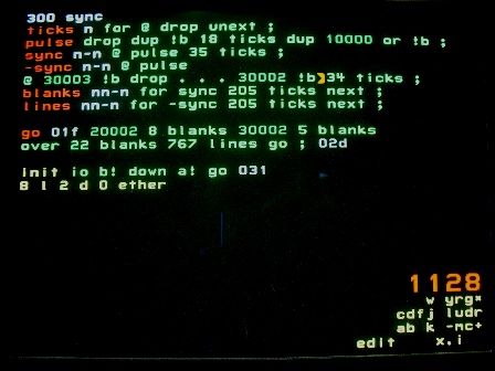 Go then generates 23 more normal blank lines at the top of the frame and 768 visible lines. Changing the balance of 23 top and 9 bottom lines, while retaining the total of 32, may adjust the vertical position of an image. This depends on the monitor and doesn't work well for me. I have to adjust the vertical position on the monitor.