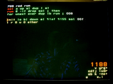 This code from block 1188 is loaded into node 709. It's a video option I'm finding increasingly useful. The duration of dark is followed by the duration of bright, in unexts. This provides full-screen resolution (1024 pixels) since a scan line is some 9000 unexts.