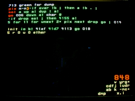 This code from block 848 is loaded into green node 713. This is one of many blocks that generate video D/A output. It displays text pixels.