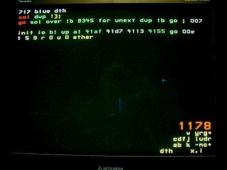 The yellow word init (for initialize) marks the end of code compiled into RAM and the beginning of code that will be executed from the comm port at load time. In this case, register b will point to the io register; register a to the up port. 41af and 4155 will be left on the stack and execution started at go.