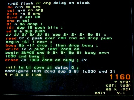 The SST25WF080 is flash memory with an SPI interface. GA144 ROM code can boot from it. It provides 1MB of memory, which I access as 512KW.
