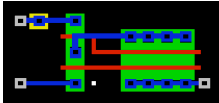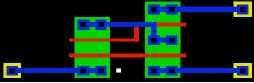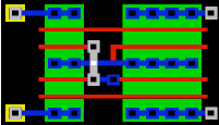 The white squares mark power contacts: a connection to a metal-2 power bus running vertically. The yellow square marks a substrate contact: Vss must periodically be connected to the substrate; and Vdd to the n-well.
