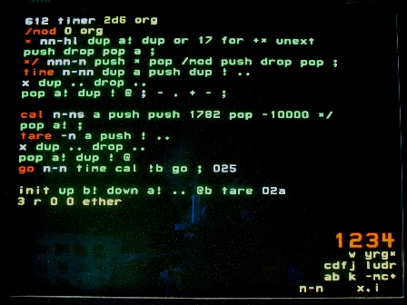 I use node 512 to generate green text. So it's convenient for 612 to act as a timer. It can talk via 712, 711 and 710 to 709 and read its counter. Then tell 512 to display it, in big decimal numerals.
